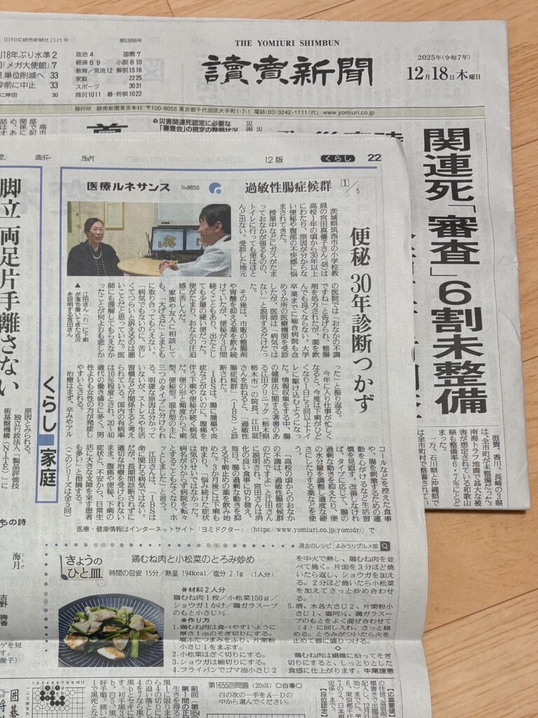 12月18日 読売新聞全国版の名コーナー『医療ルネサンス』に江田クリニックが掲載されました。|栃木県の胃カメラ・大腸内視鏡なら|江田クリニック(内科・消化器内科・アレルギー科)
